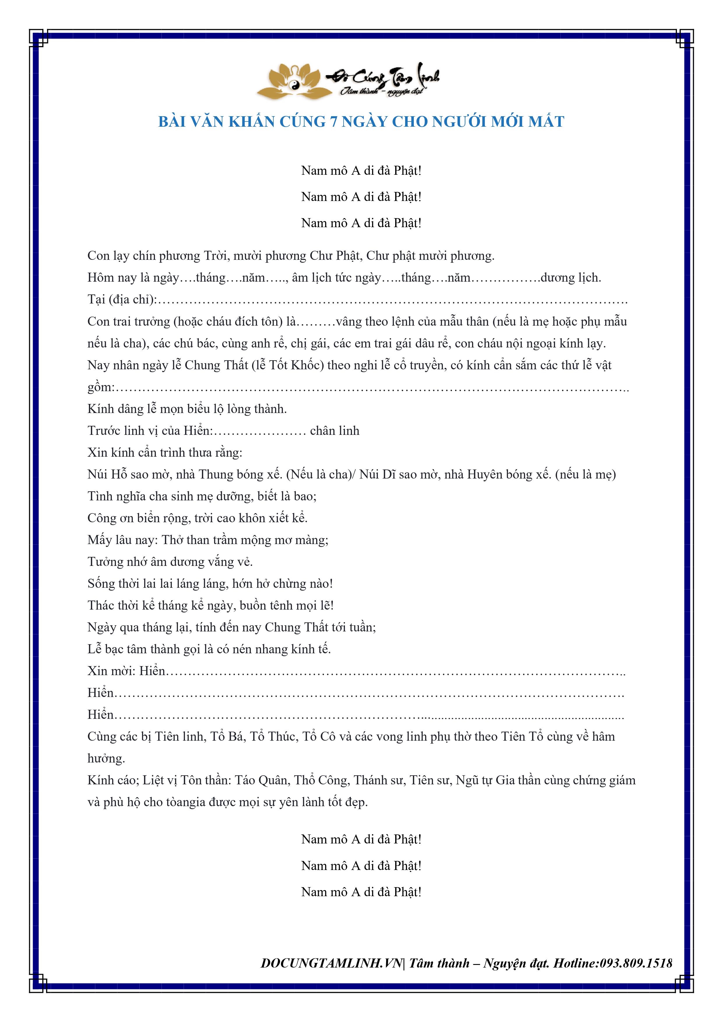 Bài Văn Khấn Cúng Thất (7 Ngày) Cho Người Mới Mất